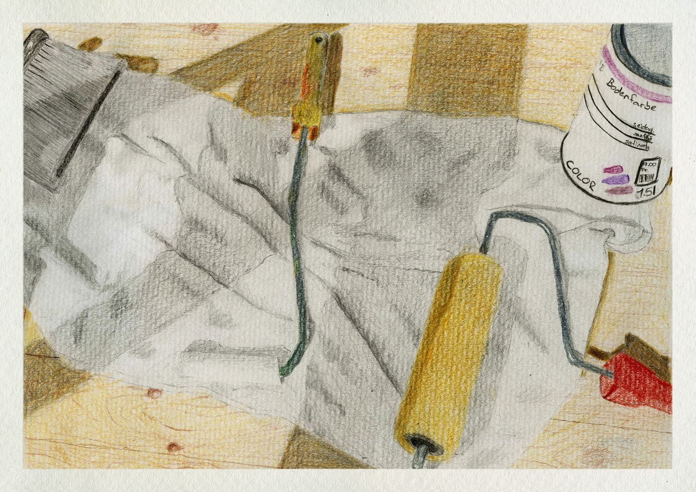 Viele Schichten sind auf diesem Bild zu bewältigen. Zuerst einmal gibt es einen Untergrund, auf welchem ein Tuch liegen soll. Dazwischen soll sich aber noch ein verdecktes Objekt verbergen. Eine Schicht also, die man unter Umständen gar nicht sieht, sondern die sich nur erahnen lässt. Dazu kommt ein Objekt, welches auf dem Tuch liegen soll, und ein Schatten soll auch noch über dem Tuch liegen. Schicht um Schicht wird das Bild aufgebaut. Schichtend soll auch mit Farbstift gemalt werden. Das heisst: vom Grünlichen ins Bläuliche an einem Ort, an der nächsten Stelle dafür eher ins Gelbliche. Zuletzt kommt natürlich noch der Faltenwurf. Damit das Tuch als solches zu erkennen ist, müssen Falten, also Faltenberge und -täler eingezeichnet werden.